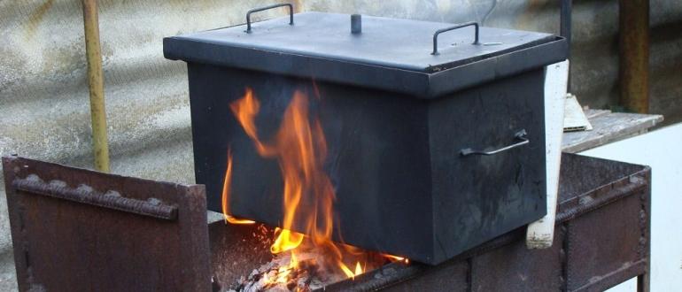 Un tel équipement n'a pas besoin d'être connecté à l'électricité et fonctionne loin de la source d'alimentation. Ils sont installés dans des cours sur un support avec des charbons, mais ils peuvent également être utilisés à l'intérieur sur des cuisinières à gaz et électriques. Souvent, ces conceptions seront moins chères et plus spacieuses que les fumoirs électriques.